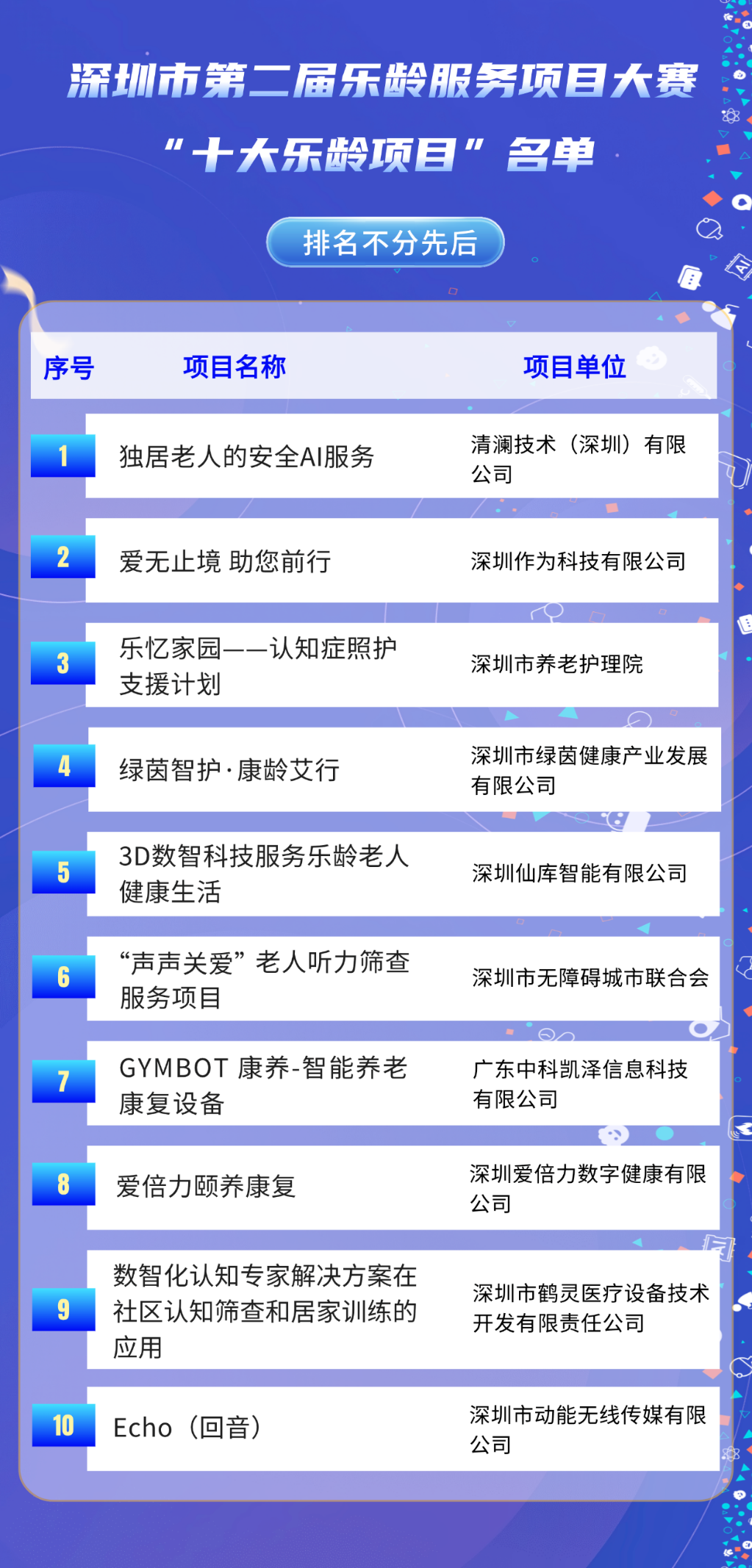 在经过一系列激烈的入围赛和晋级赛后,20个杰出项目成功突围,跻身决赛的激烈角逐。这些项目经过专家评审团和老年评审团的独立评分、专家评审团集体审议,并经大赛主办单位审定后,最终评选出了“十大乐龄项目”。经专家评审团评审,深圳爱倍力数字健康有限公司凭借【爱倍力颐养康复】项目获得“十大乐龄项目”荣誉。所有获奖项目将在未来一年内在深圳展开服务并实施,旨在为深圳养老服务的高质量发展注入新的活力,同时为国内大城市面临的养老难题提供可借鉴和可推广的深圳经验。